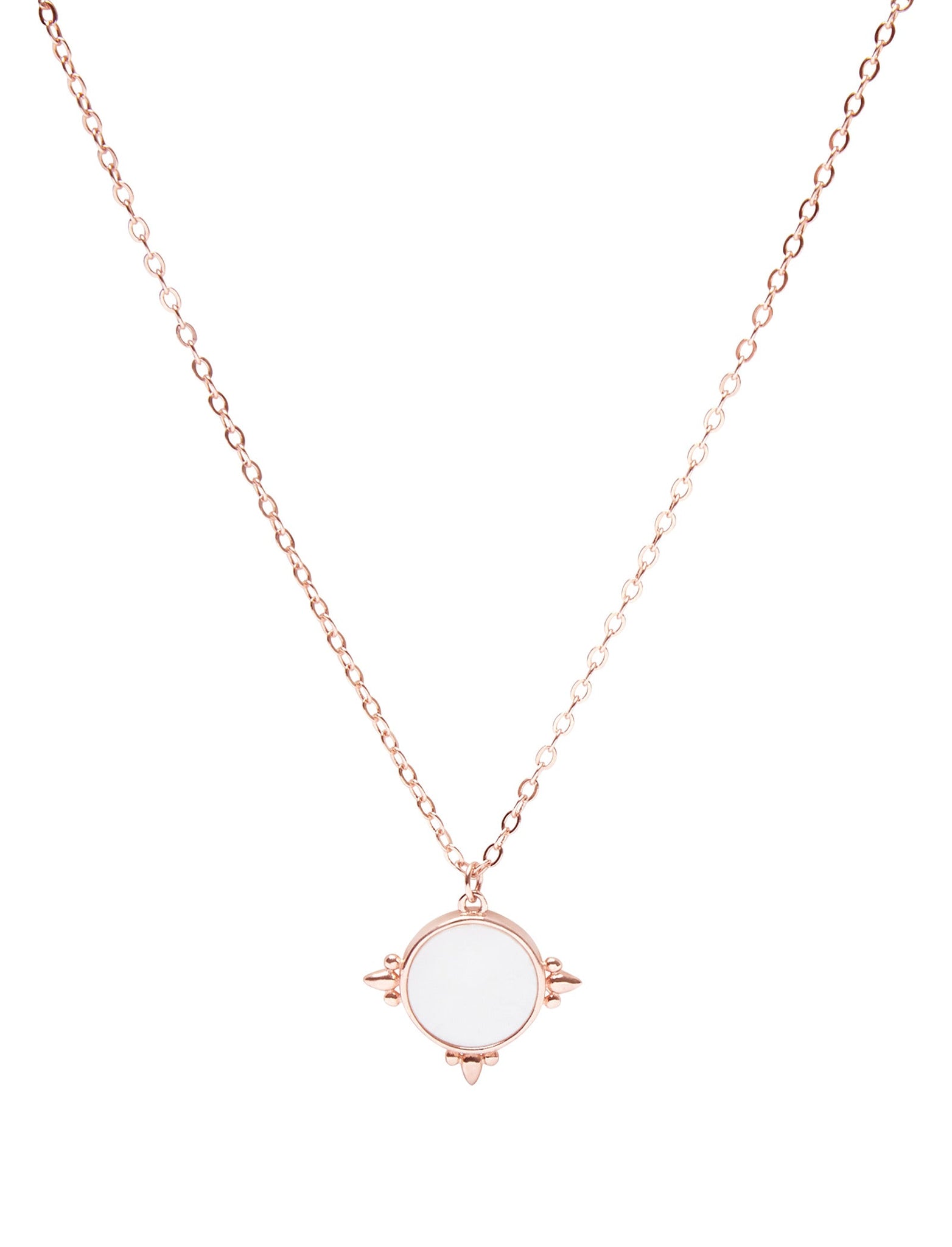 At its core lies a resplendent mother of pearl disc that is encased in a teardrop embellished setting, imparting a touch of magic to your overall look The beautifully crafted pendant is 15mm by 15.5mm in size and sweeps gracefully at the middle of the chest on a 42cm chain.